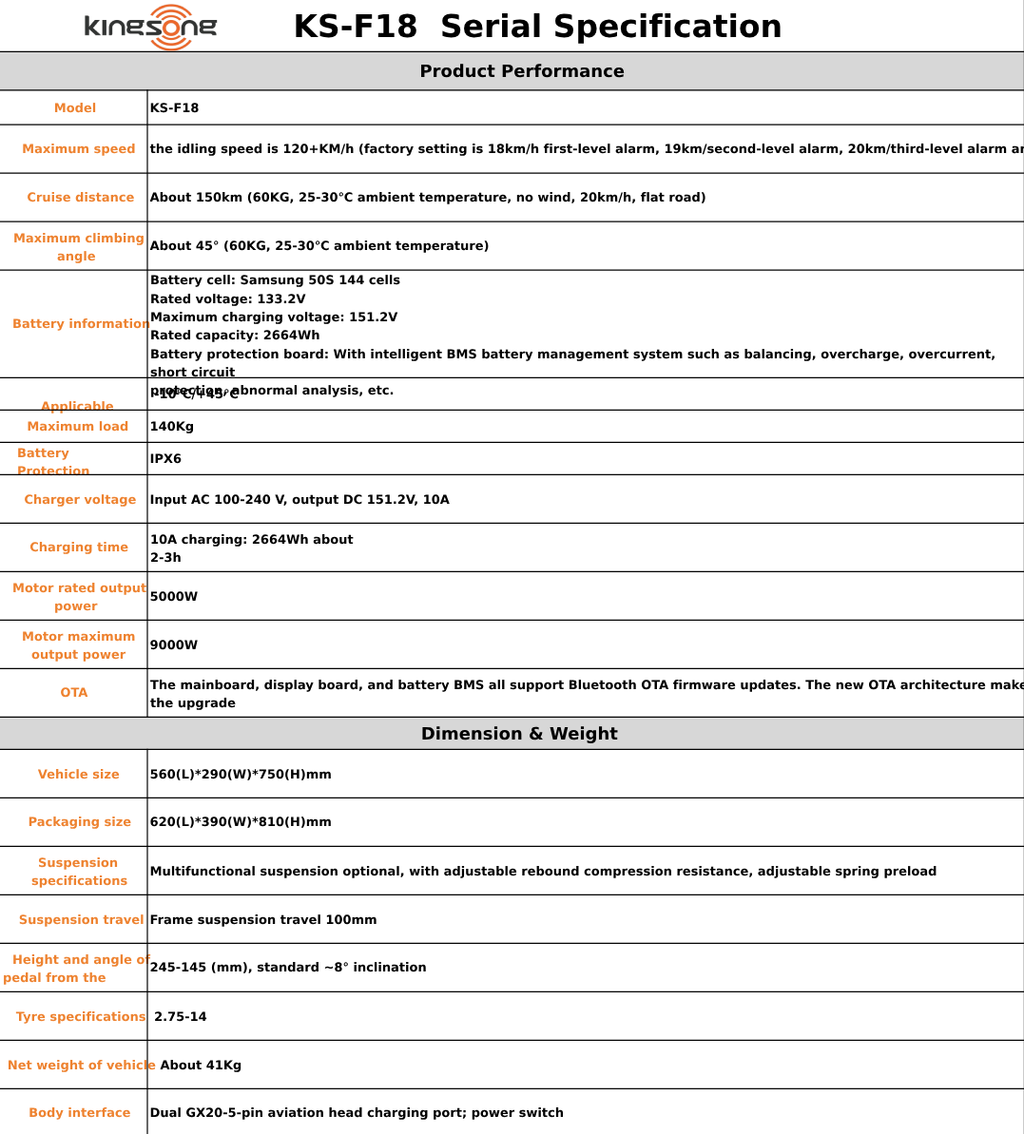 Motoreffekt: Bedömd till 5 000 W, med en toppeffekt på 12 000 W.Topphastighet: Fortfarande obekräftad, men vi har redan nått 90kmh (GPS-verifierad), med en lyfthastighet på upp till 130kmh.Batterikapacitet: Utrustad med ett Samsung 50S 2664Wh litiumjonbatteri, som erbjuder en maximal räckvidd på upp till 150 km under idealiska förhållanden. Räckvidden i verkligheten varierar avsevärt beroende på hastighet - förvänta dig minst halva denna räckvidd när du kör aggressivt.Laddning: Inkluderar en 10A snabbladdare, som levererar 1 700 W kraft. Laddar från 50 % på mindre än en timme – den snabbaste OEM-laddaren som finns.Fjädringssystem: Har ett anpassat fyrstötdämpningssystem från DNM, med justerbar dämpning och förspänning för olika ryttarevikter.Klättringsförmåga: Klarar branta lutningar upp till 45° med lätthet.Moderkort: Ny design av hög kvalitet för förbättrad tillförlitlighet.
